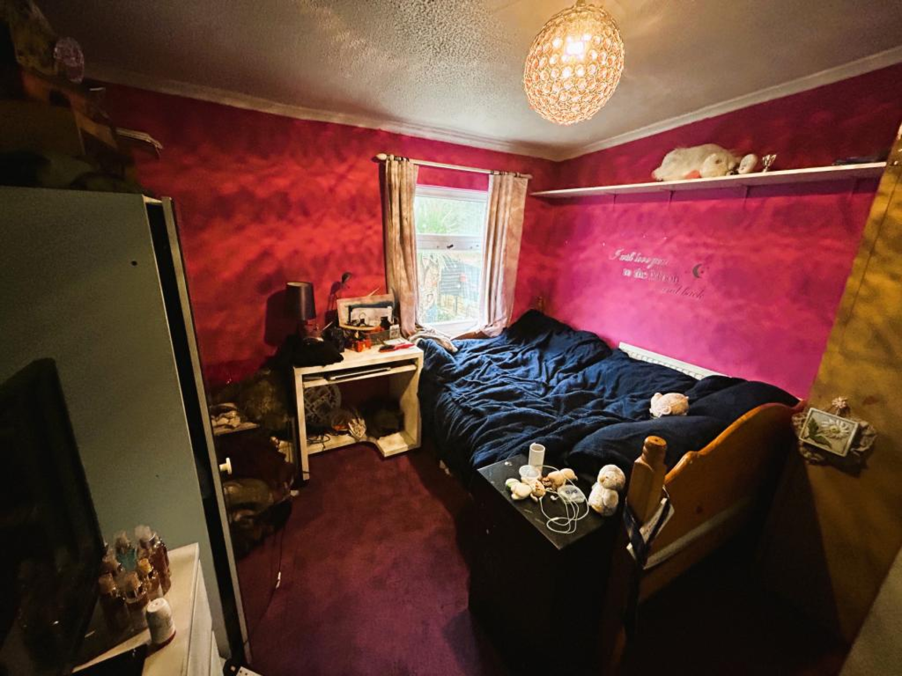 uPVC double glazed window to front aspect, fitted carpet, radiator, wall cupboard with shelving and textured ceiling with coving and ceiling light.