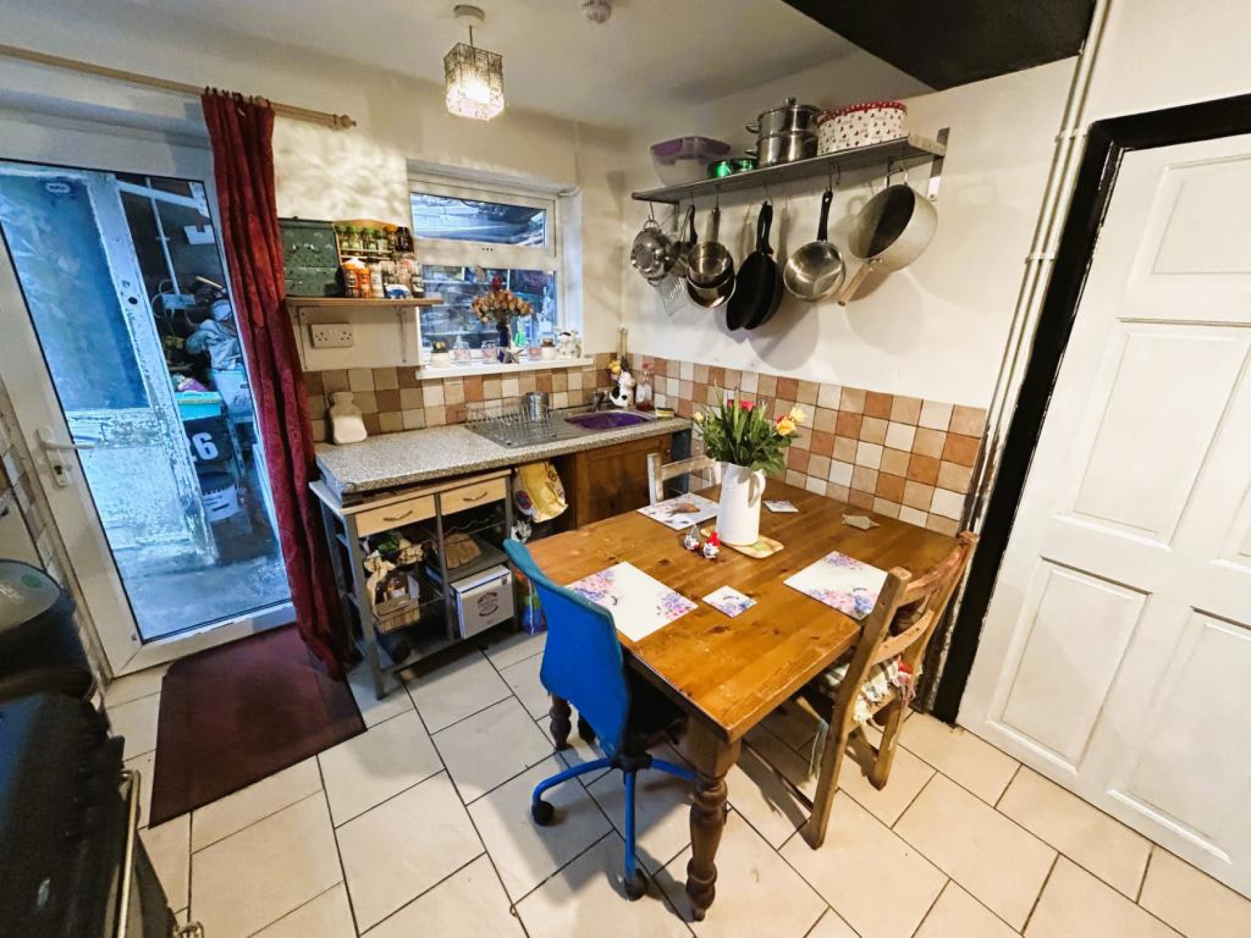 Plumbed for washing machine and dryer, storage shelving and uPVC double glazed external door to rear garden.