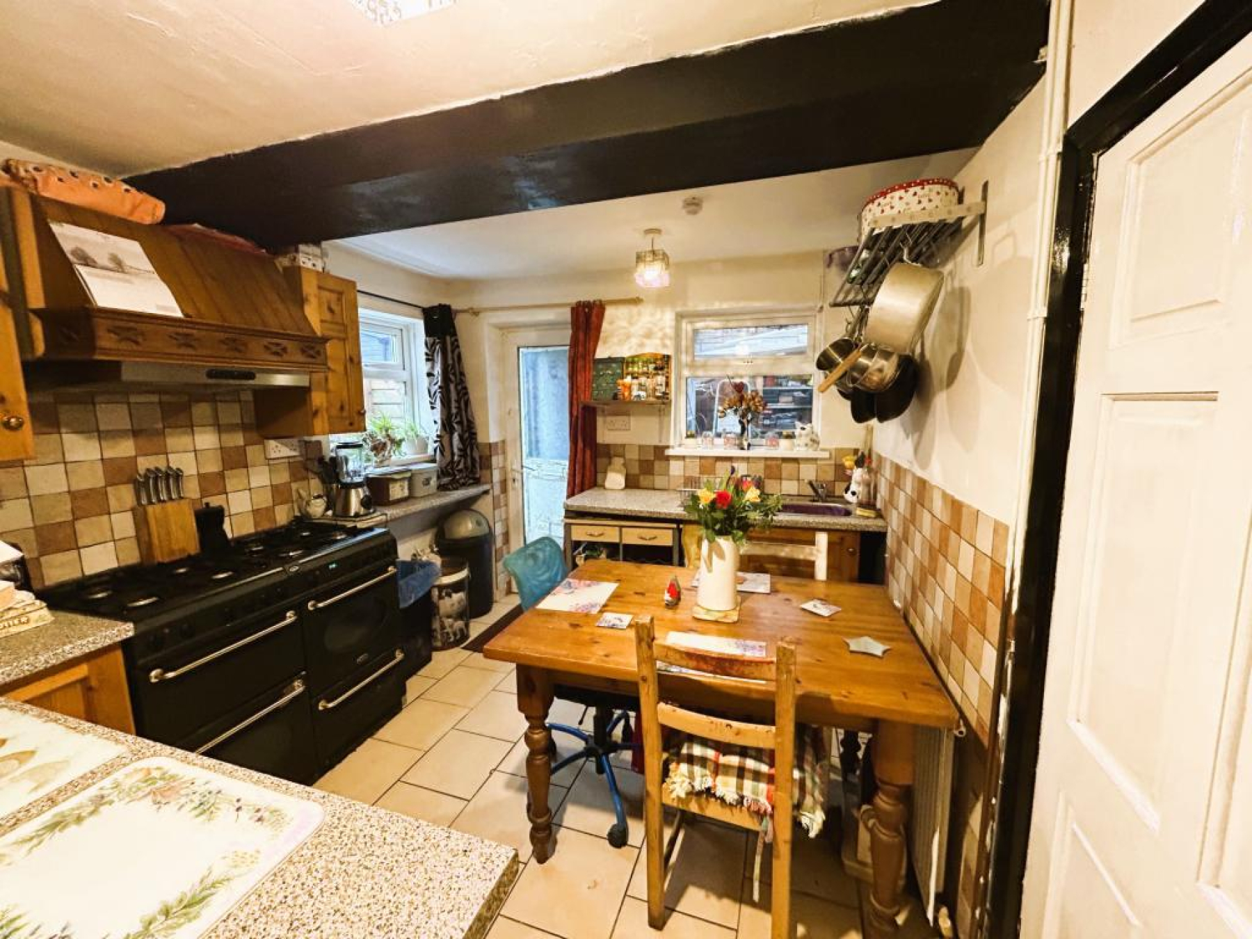 Fitted with a range of wall & base units with work preparation surfaces over, incorporating a stainless steel sink with drainer, space for free standing range style cooker, over head extractor canopy, space for under counter fridge/freezer, ceramic tiled flooring, radiator, exposed ceiling beam and ceiling light and uPVC double glazed window to rear aspect.