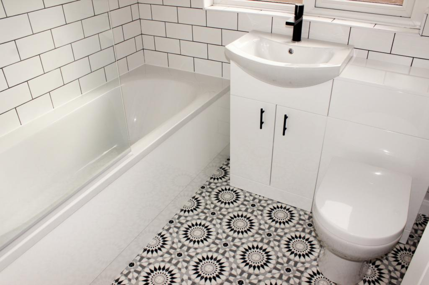 Fitted with a one piece vanity unit with integrated WC and wash hand basin, panelled bath with overhead mains rainfall shower, tiled effect lino, brushed steel heated towel rail. Part tiled brick effect walls, smooth ceiling with ceiling light and uPVC frosted double glazed window to rear aspect.
