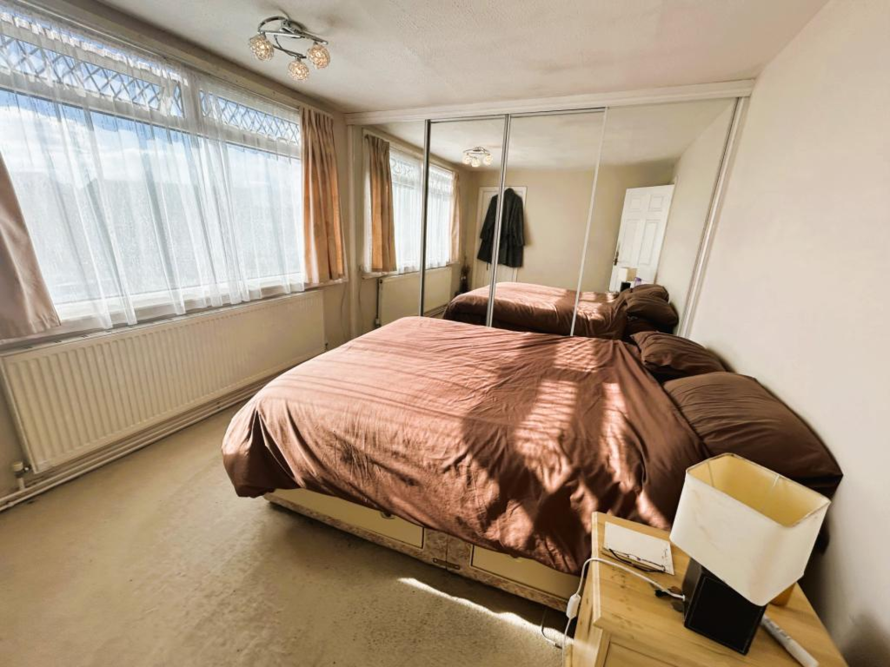 uPVC double glazed window to front aspect, carpet, radiator, fitted floor to ceiling mirror door wardrobe, further wall cupboard and ceiling light.