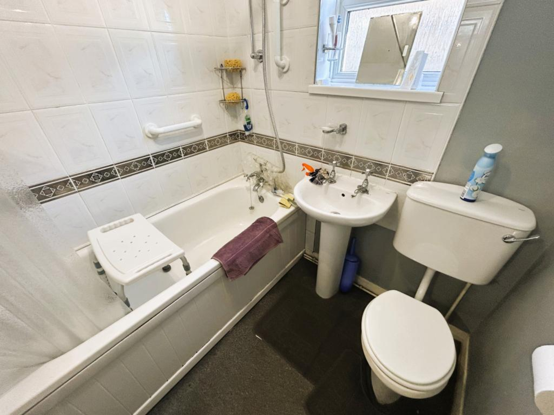 Fitted with a three piece suite comprising of a low level WC, wash hand basin with pedestal, paneled bath with attached mains shower, part tilled walls, ceiling light and uPVC frosted window to side aspect.