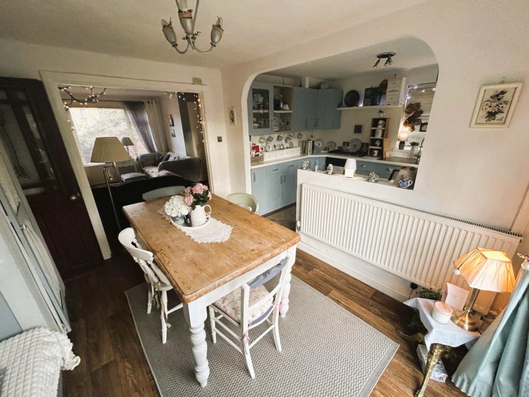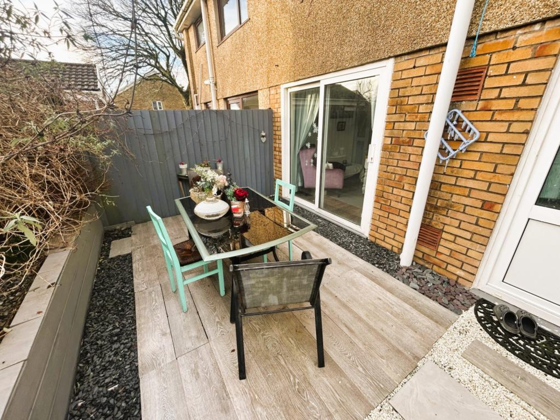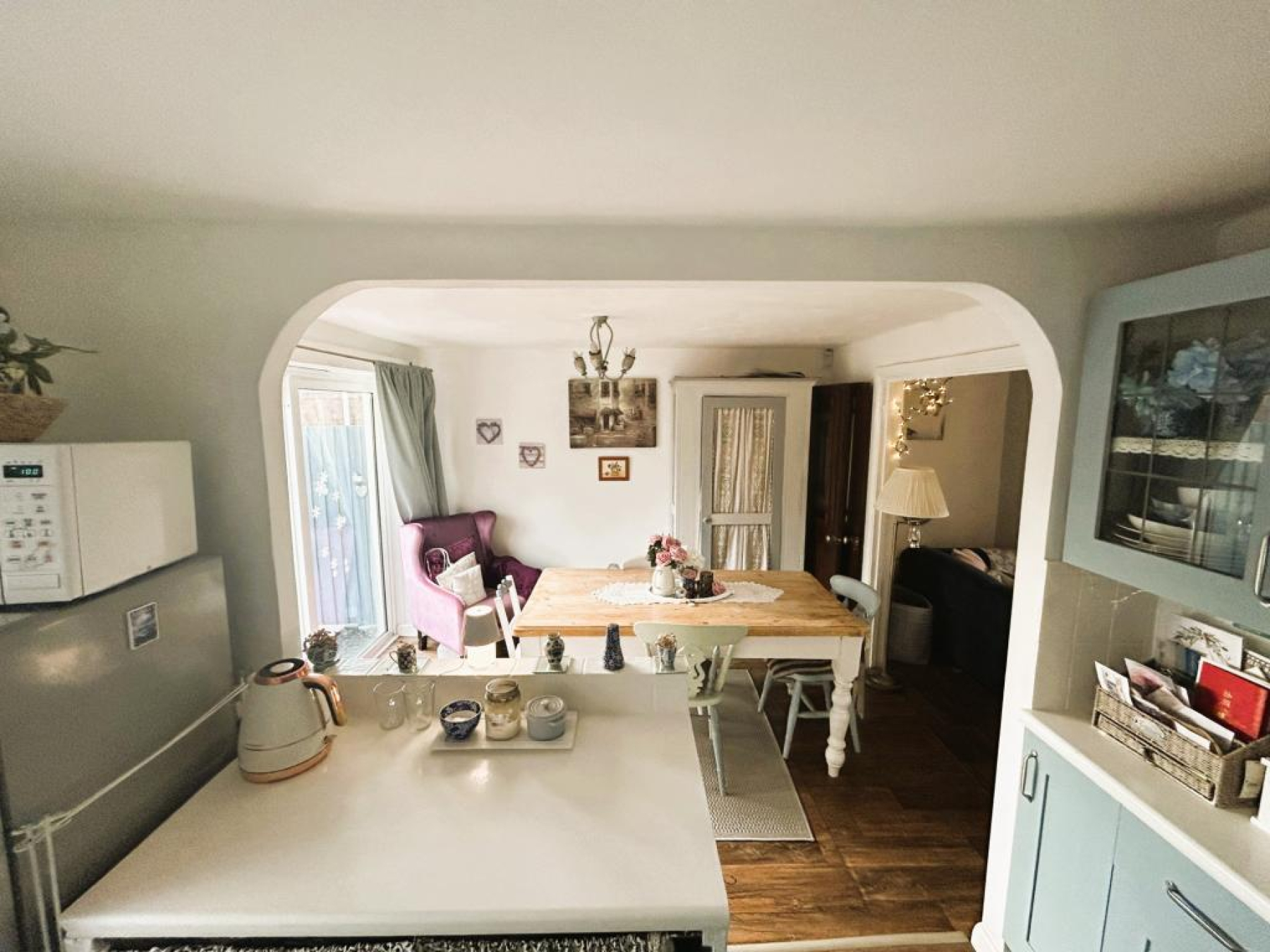 uPVC double glazed patio sliding doors opening onto rear patio area, wood laminate flooring, radiator and ceiling light.