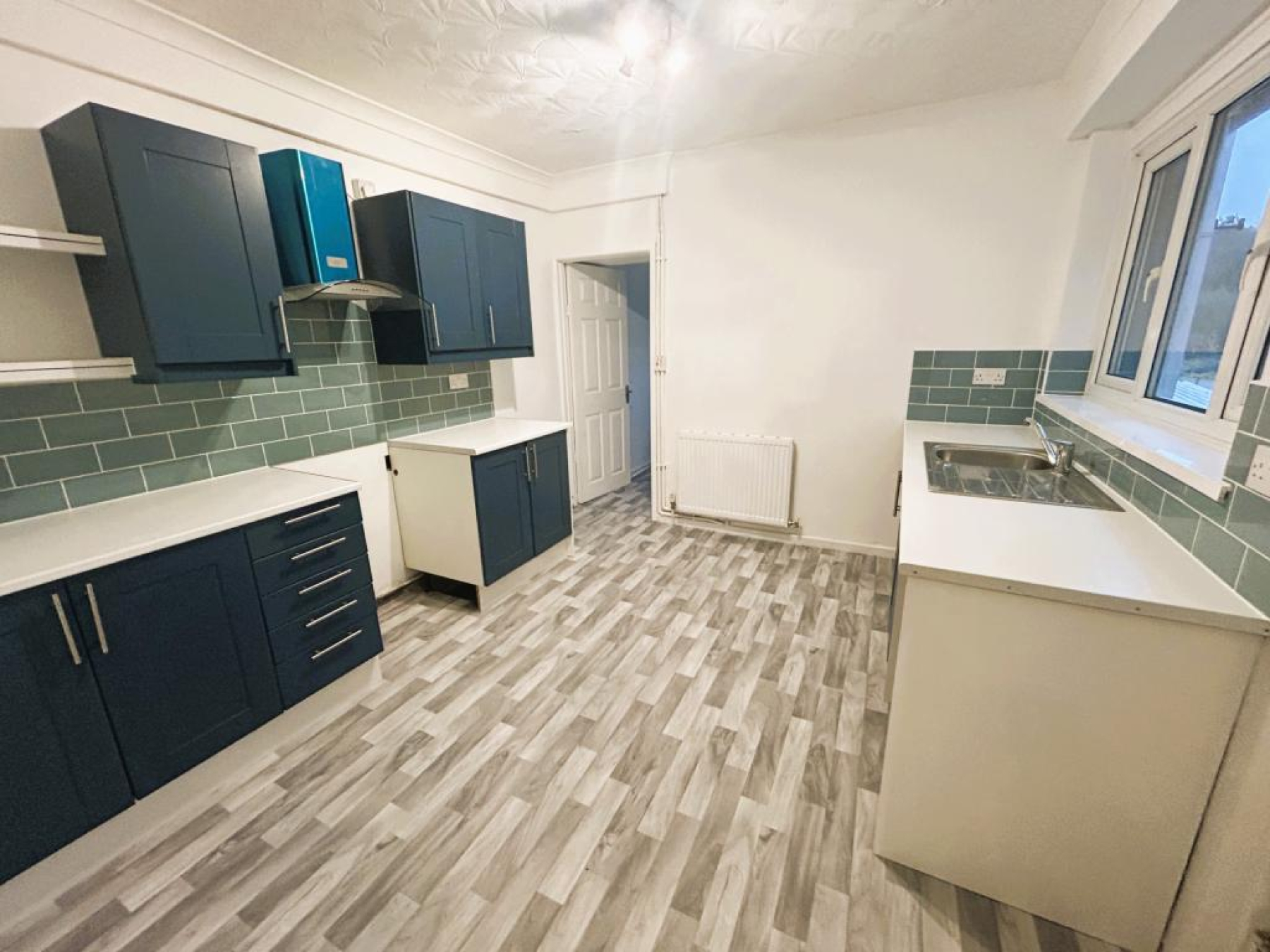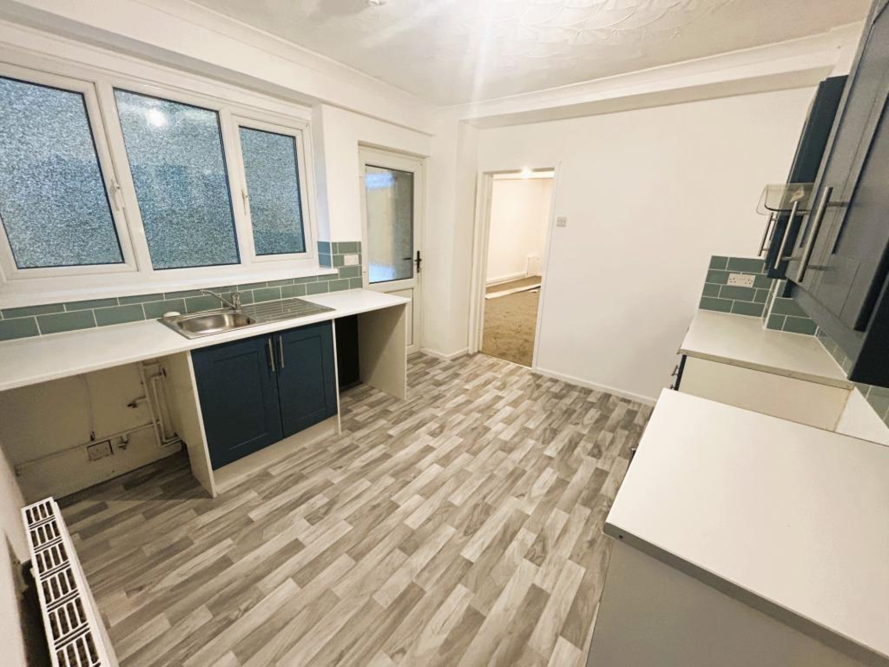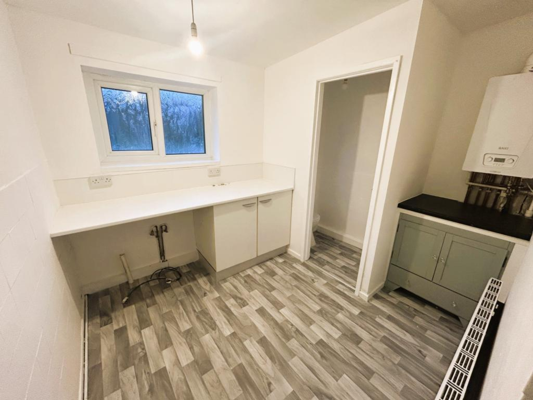 Fitted with base units with work preparation surfaces over, plumbed for washing machine, wall mounted (Baxi) boiler, radiator, smooth ceiling with ceiling light and uPVC frosted window to rear aspect.