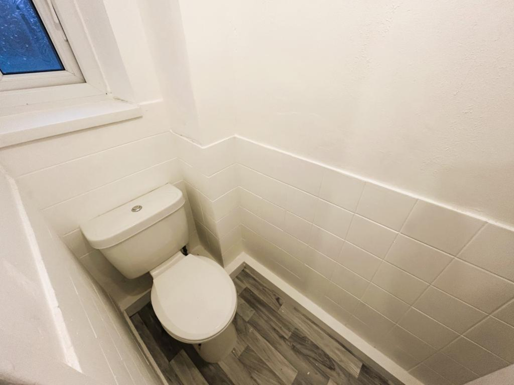 Low level WC, part tiled walls, ceiling light and uPVC frosted window to rear aspect.