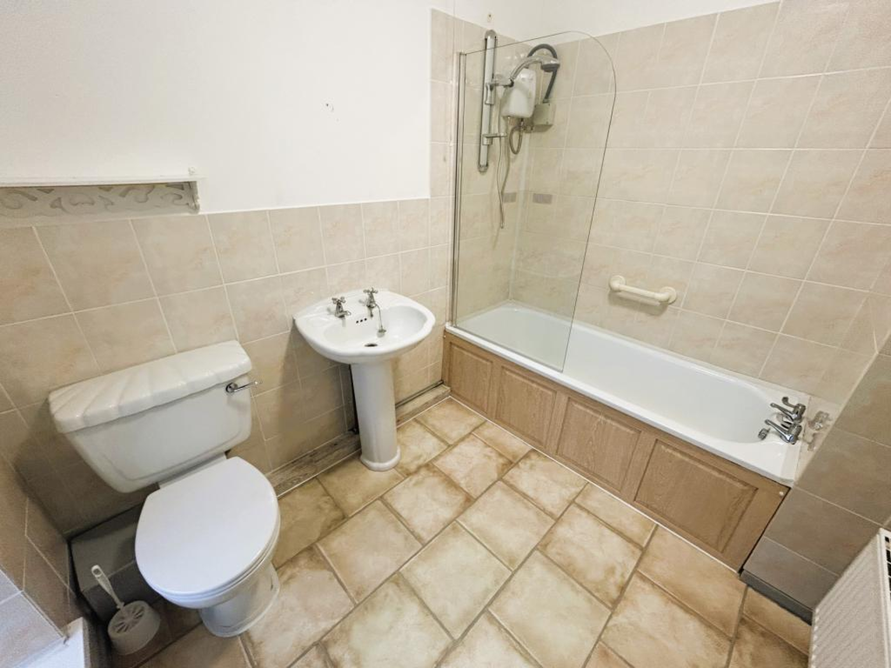 Fitted with a three piece suite comprising of low level WC, wash hand basin with pedestal, paneled bath with over head shower, part tiled walls, radiator, ceiling light and uPVC double glazed window to rear aspect.