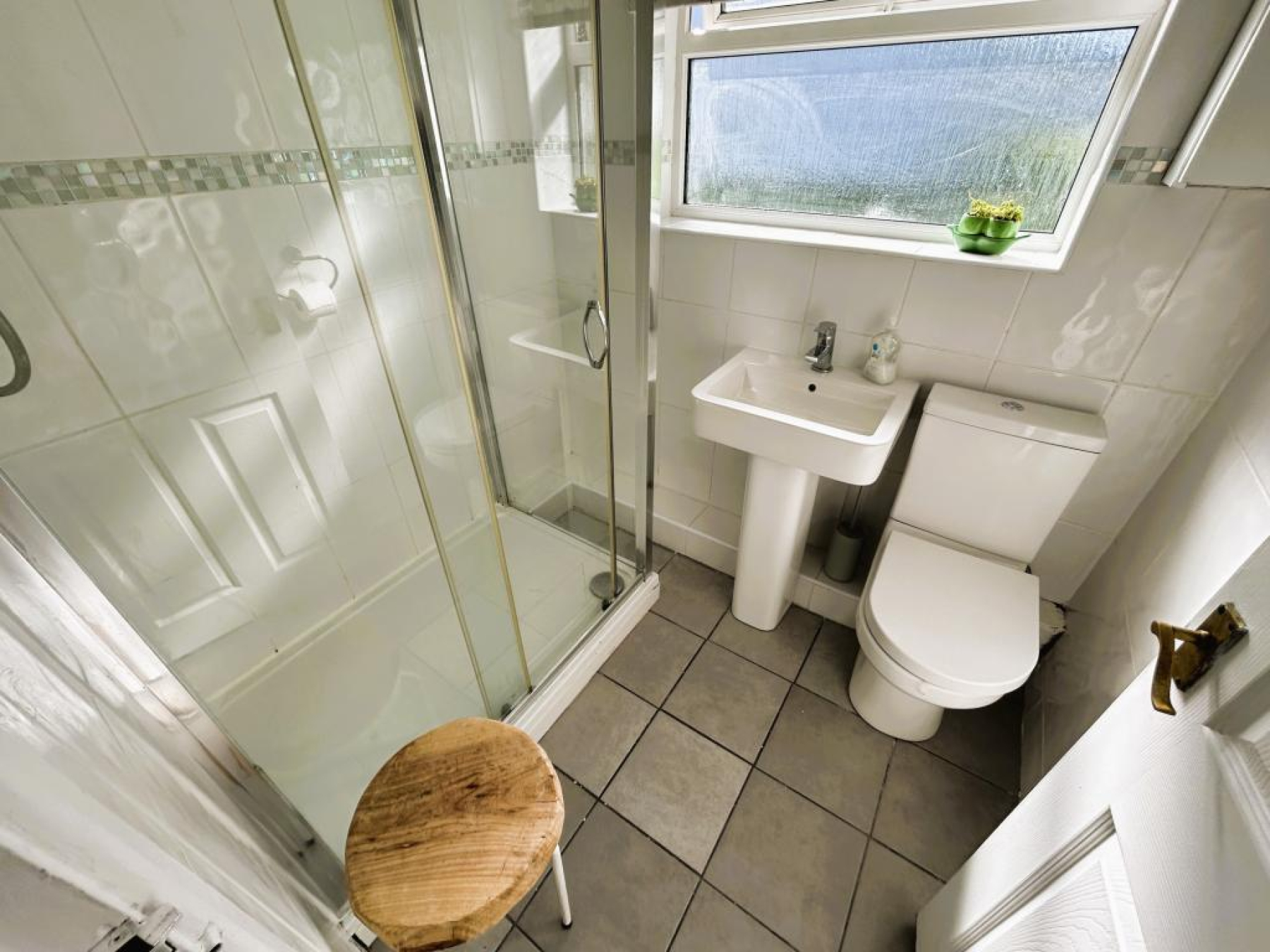 Fitted with a three piece suite comprising of low level WC, wash hand basin with pedestal, walk-in shower with over head electric shower, floor to ceiling tiles and uPVC frosted window to rear aspect.