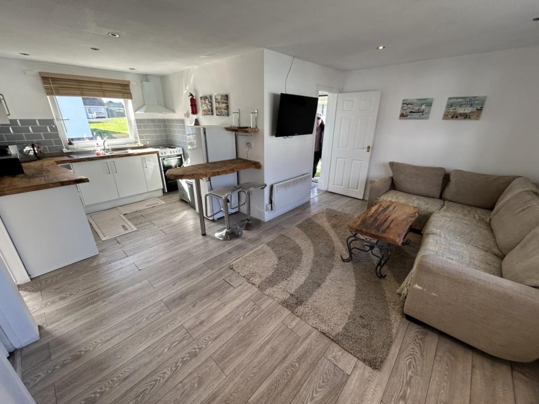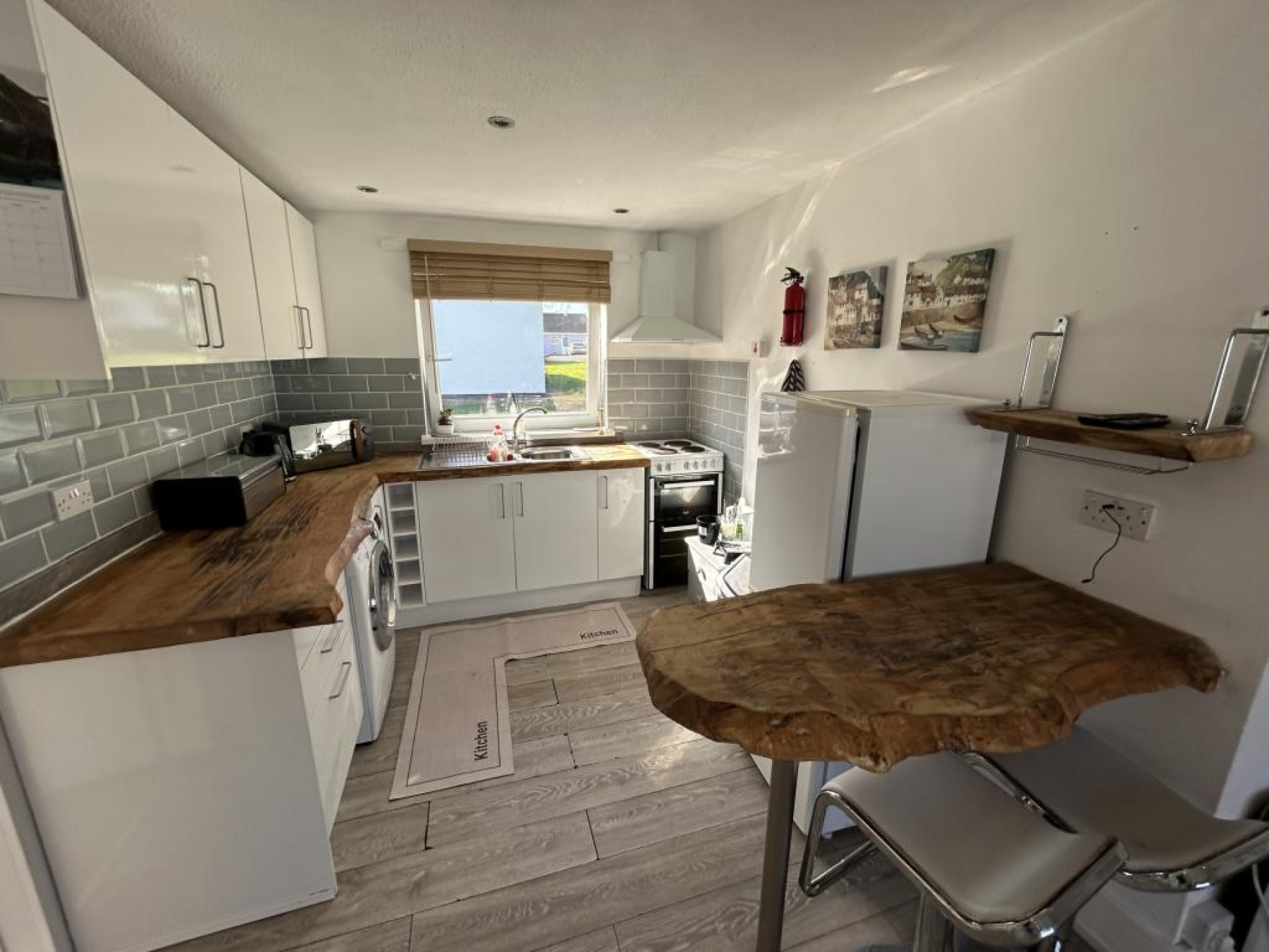 Fitted with range of wall and base units with spoilt beach wood preparation work tops over over incorporating a stainless steel sink with drainer, plumbed for washing machine and space for freestanding electric cooker, breakfast bar, dual aspect uPVC double glazed window to front and rear aspect.
